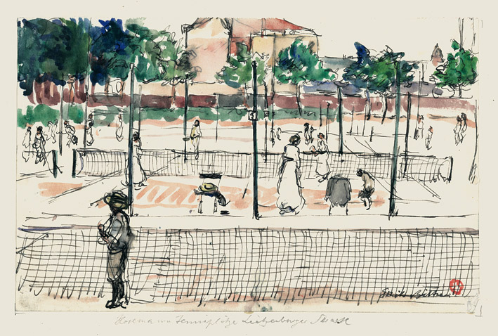 9 Erich Büttner Hosemann Tennisplätze Lietzenburger Straße Tuschfeder, aquarelliert, signiert, bezeichnet, 128 x 200 mm, um 1930 *€ 450,-