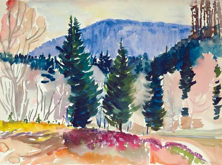 Junger Wald vor blauem Berg