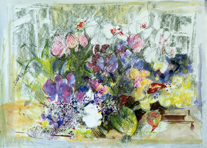Blütenkomposition vor hellem Wintergartenfenster